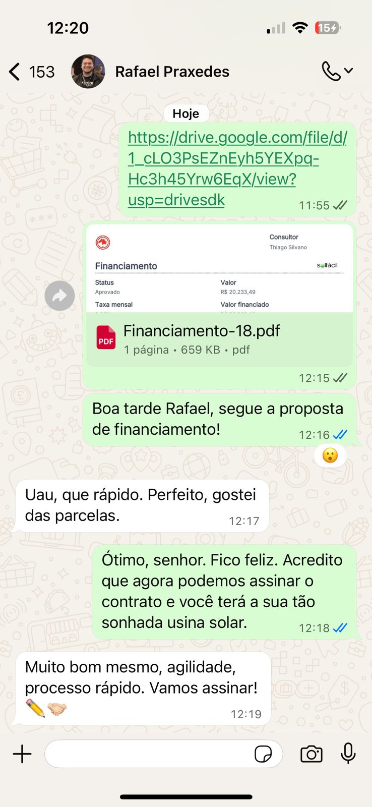 Não é mais necessário voltar ao escritório para gerar uma proposta. Com o aplicativo, você consegue criar propostas de forma rápida e no momento da visita ao cliente, já com as informações mapeadas do telhado e do sistema solar. O processo de financiamento também pode ser gerado diretamente do campo, otimizando o tempo e melhorando a experiência para o cliente.