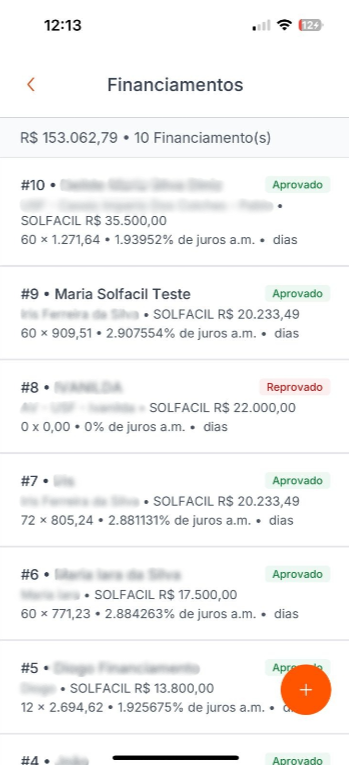 02 - Logo depois, abrirá o menu com a lista de financiamentos já gerados, sendo possível acessá-los e editá-los quando for necessário. Com o botão laranja "+", é possível criar novas propostas de financiamento.