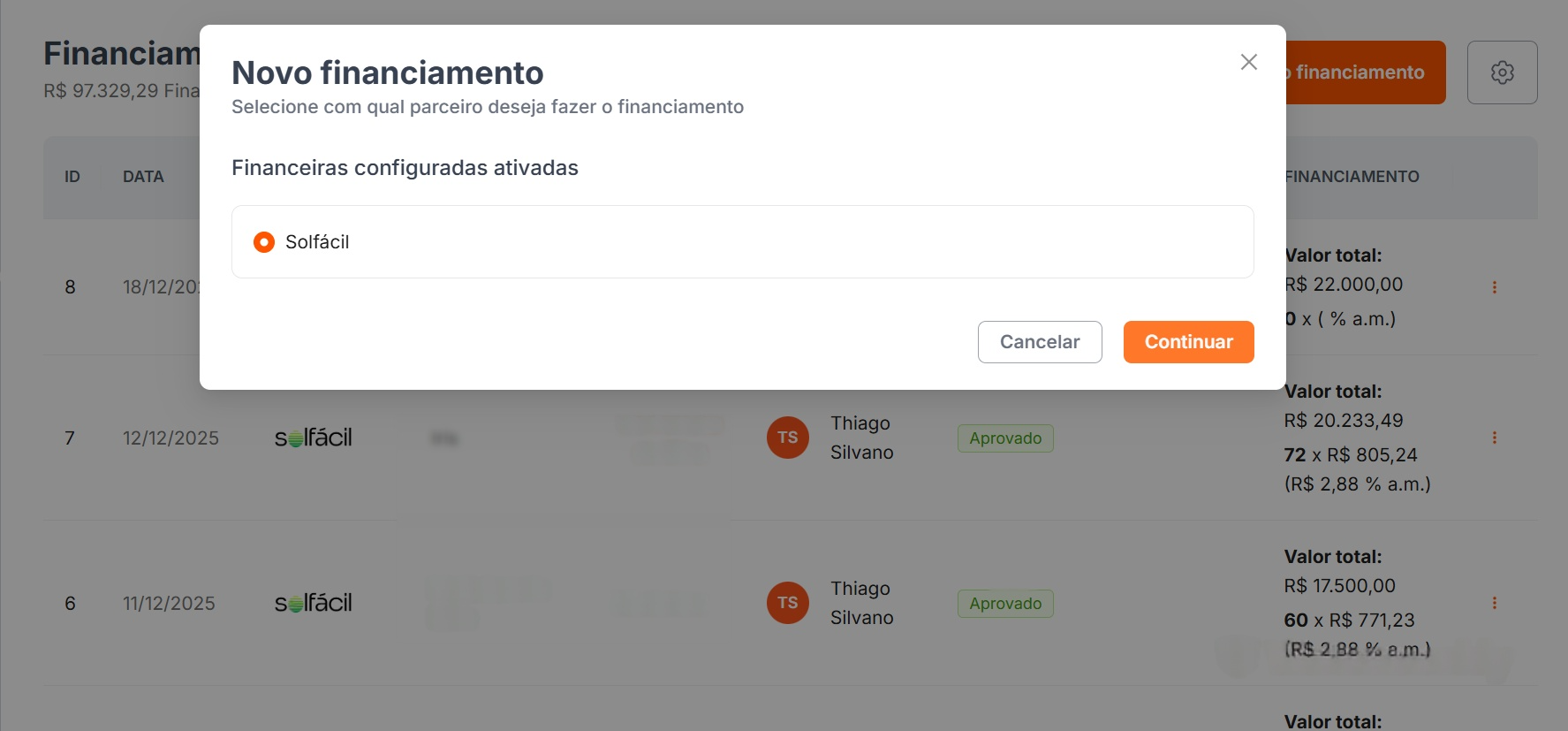 Selecione a financeira/banco integrador (ex.: Solfácil)