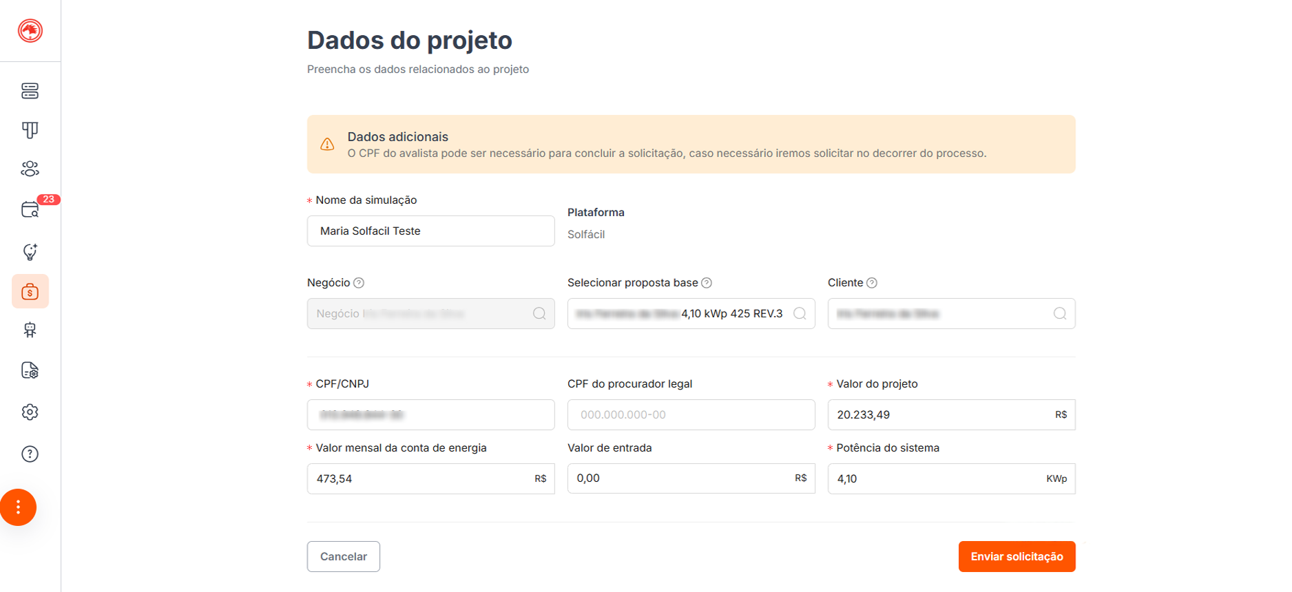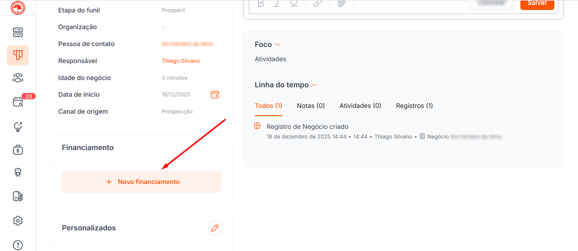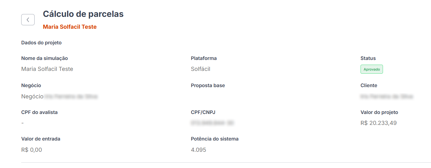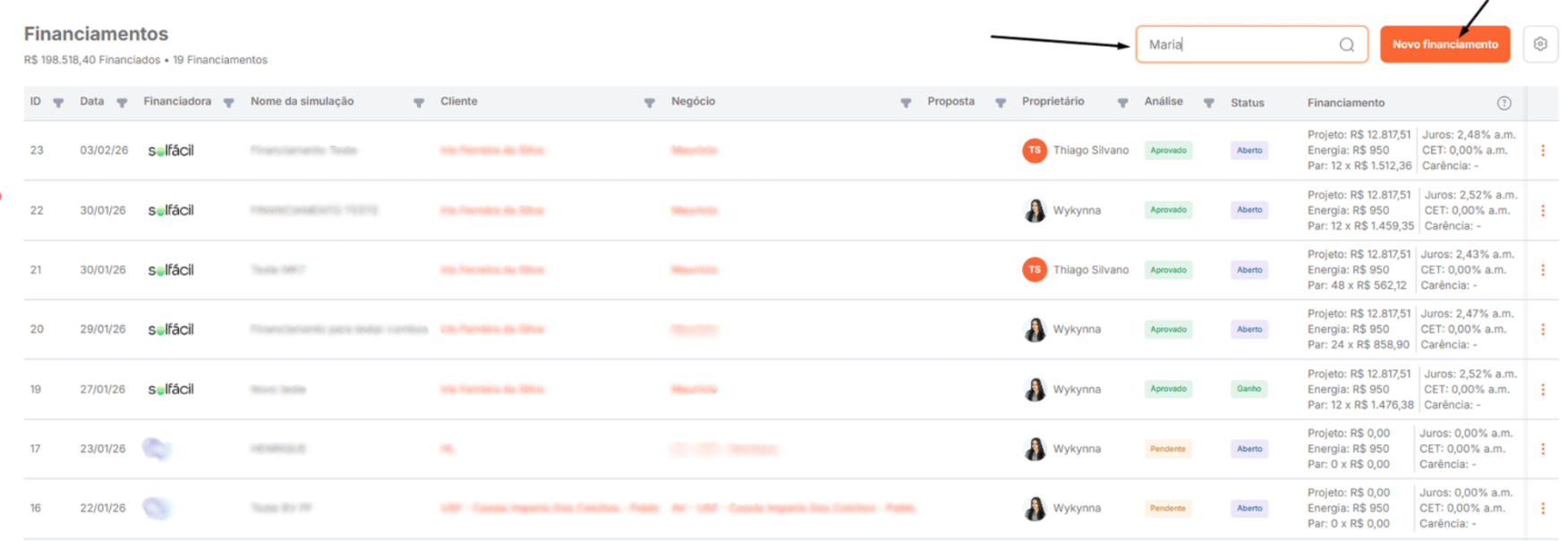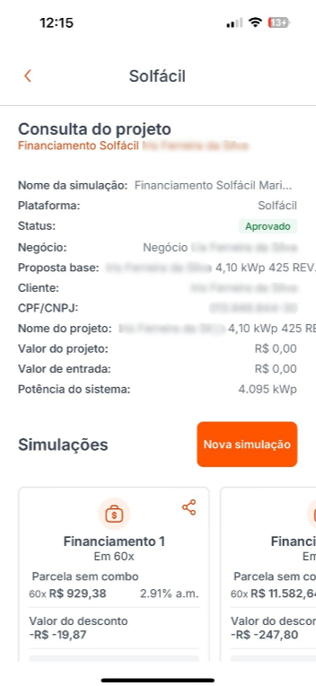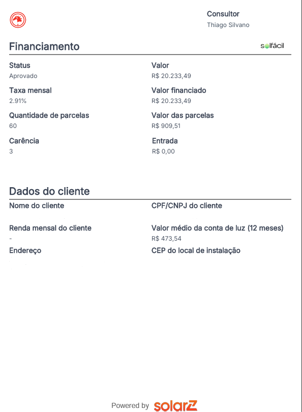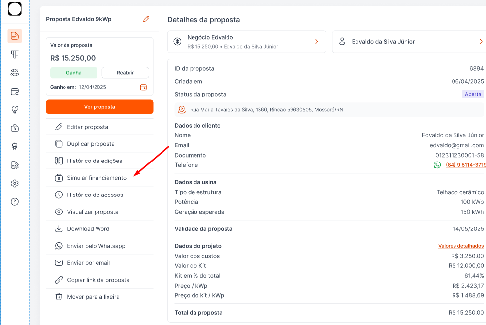 Também é possível criar uma proposta de Financiamento após gerar a proposta de orçamento da usina ou dentro do negócio do cliente: