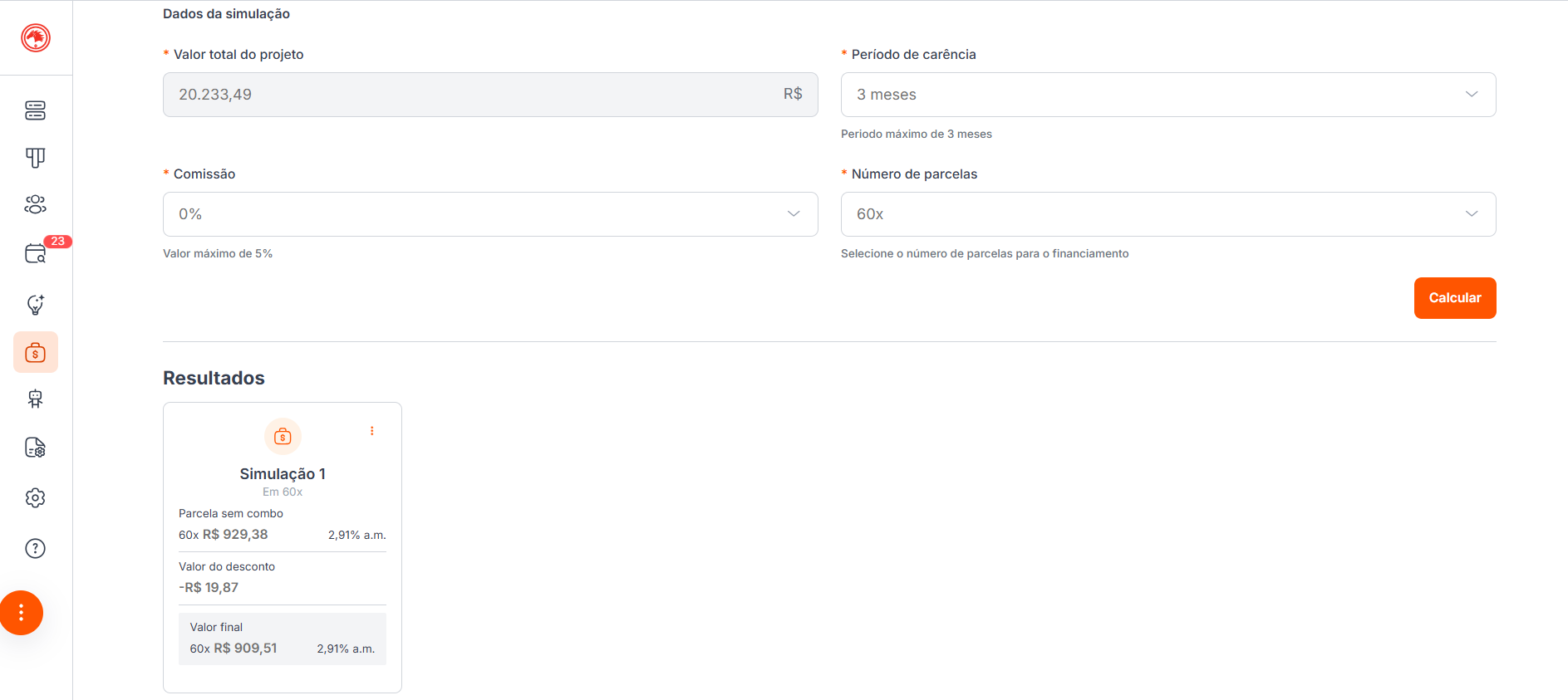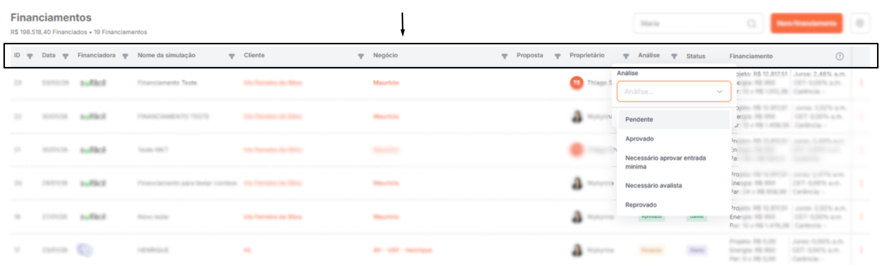 02 - Logo depois, abrirá o menu com a lista de financiamentos já gerados, sendo possível acessá-los e editá-los quando for necessário. Com o botão laranja "+", é possível criar novas propostas de financiamento.