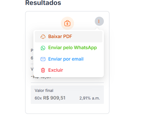 05 - Depois desses 4 passos, chegamos ao passo final onde é possível visualizar caso tenha sido aprovada as propostas de financiamento. Podendo ser feito download, enviadas via e-mail ou whatsapp: