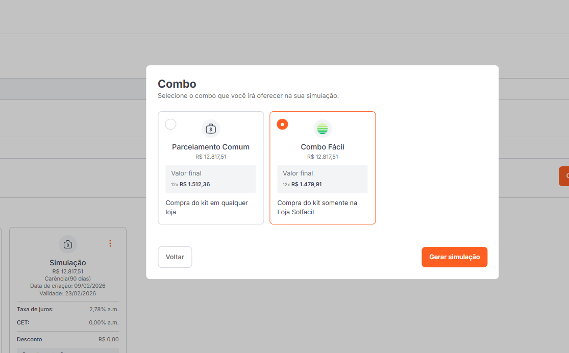 Após clicar em 'Calcular', você poderá selecionar a modalidade de financiamento de sua preferência: o Parcelamento Comum, que foca na liberação direta do crédito, ou o Combo Fácil, que oferece a conveniência da compra de equipamentos pela Solfácil com descontos exclusivos.