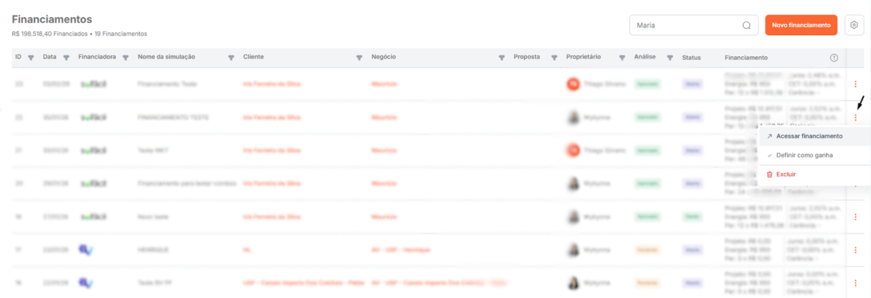 Lista de todas as propostas já criadas, podendo Acessar o financiamento já criado para edição, dar proposta como ganha ou Excluir